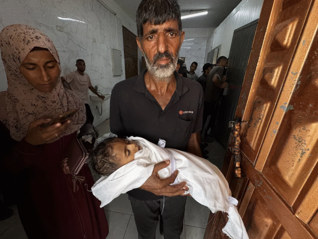 Mężczyzna niesie na rękach 5-letniego Jamala. Chłopiec zmarł z głodu. Jego waga spadła z 16 do 7 kg. Zdjęcie z 12 sierpnia 2025